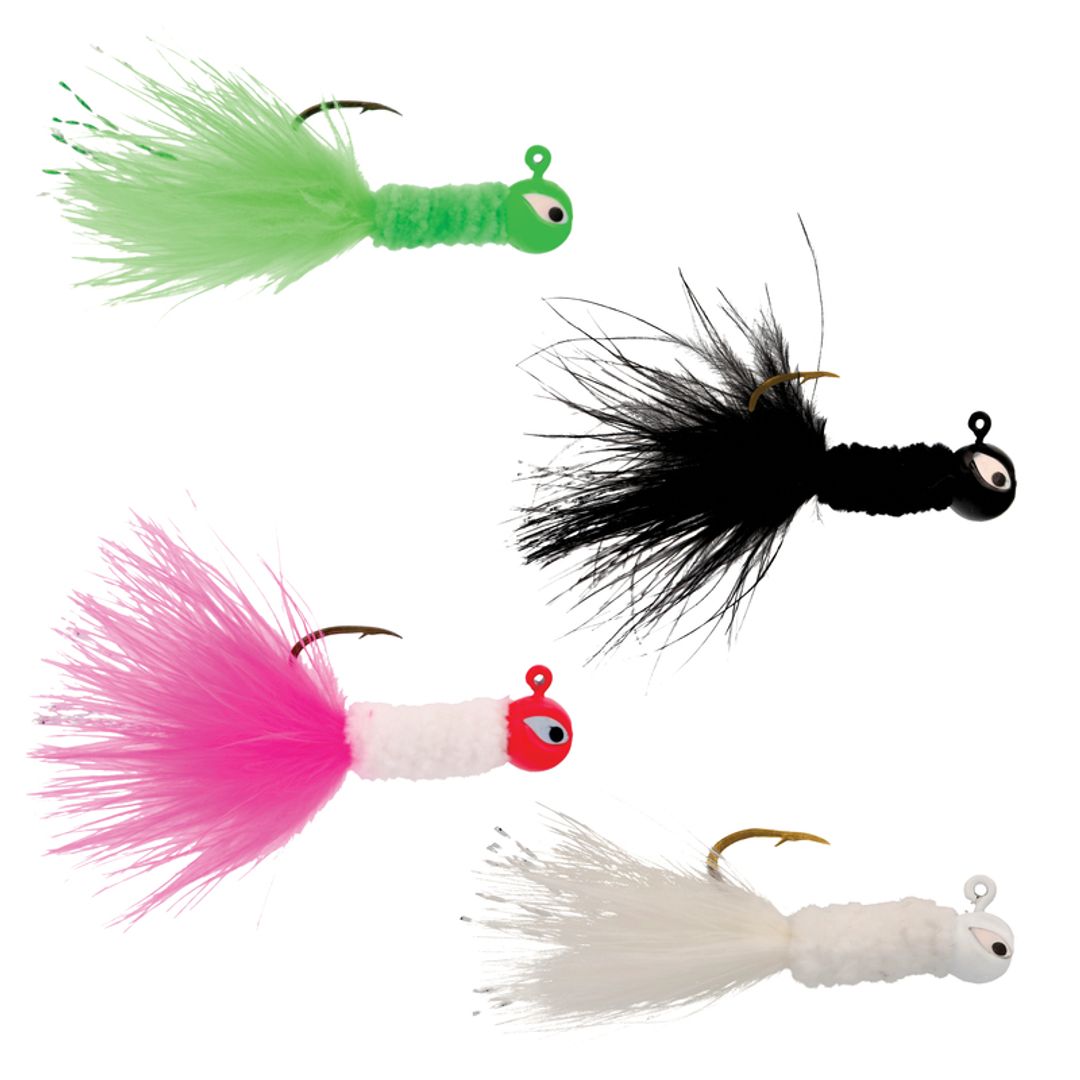 Pro-V Crappie Chenille Jigs are comprised of an Eagle Claw® 500 Jig Hook featuring the all-new Flying Eye Head. With uniquely shaped holographic eyes, the Flying Eye Head design also adds a touch of flash that crappie can't resist. The Pro-V Crappie Jigs are dressed with a hand-tied chenille body paired with a tinsel flash marabou tail.